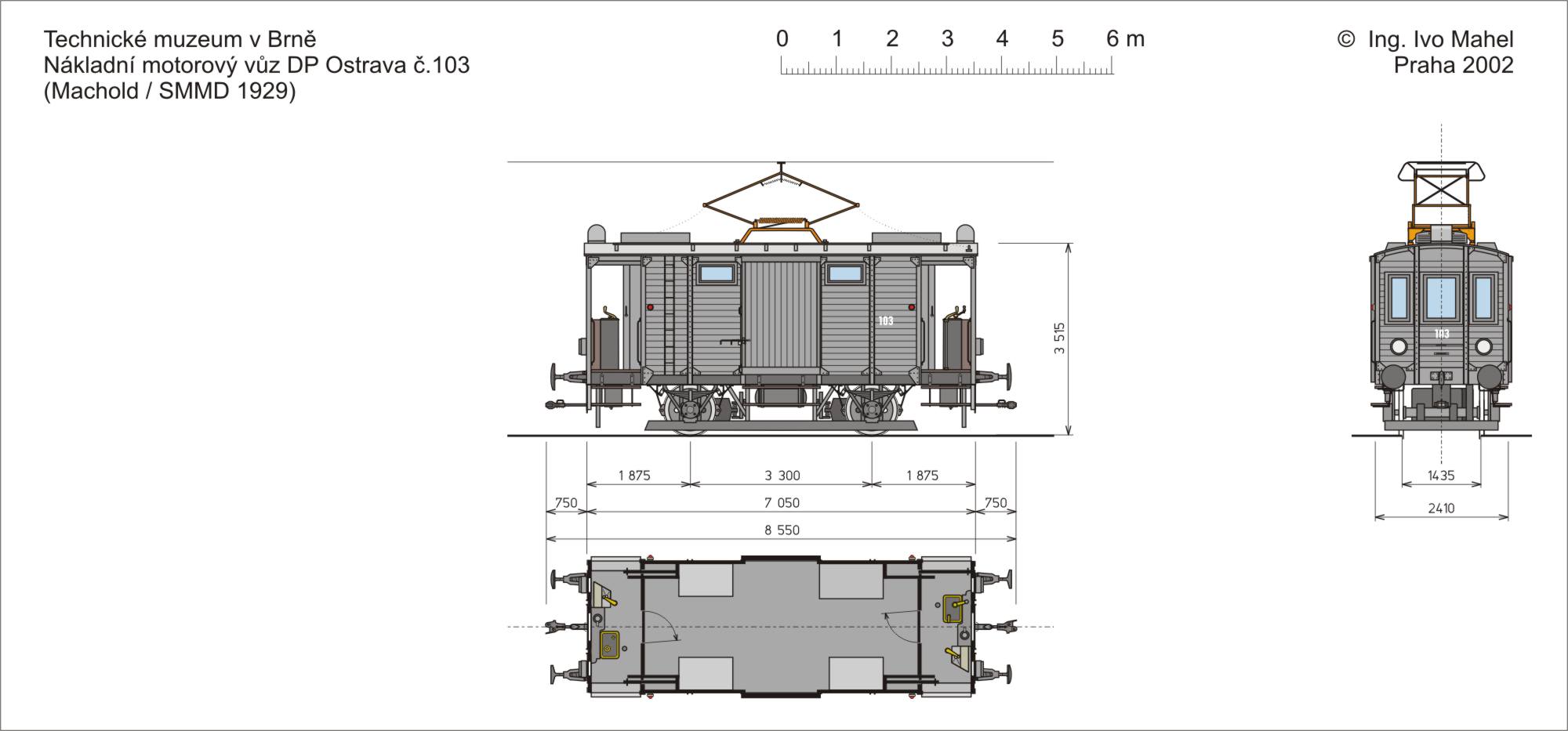 Dvounápravový volnoosý pojezd sestával ze dvou náprav s kluznými ložisky a plnými koly, vedenými rozsochami přinýtovanými na podélníky, odpružení zajišťovala listová péra. Nákladní motorové vozy byly vybaveny zařízením tlakovzdušné brzdy, zdrojem stlačeného vzduchu byl elektrický kompresor. Mimo to byla k dispozici ruční zajišťovací brzda stejně jako možnost elektrodynamického brzdění. Výkony nákladní dopravy provozované na tramvajových tratích Ostravě byla zcela nesrovnatelné s ostatními provozy. Svého vrcholu dosáhly v padesátých letech při výstavbě sídliště Poruba, kdy byly postaveny ještě dva shodné motorové vozy. Poslední nákladní vlak byl vypraven teprve 31. ledna 1972, avšak nákladní motorové vozy byly nadále využívány jako služební. Do sbírek Technického muzea v Brně byl předán vůz č. 103 až v roce 1989. Zatím zůstává v posledním provozním stavu včetně oranžového nátěru vozové skříně.